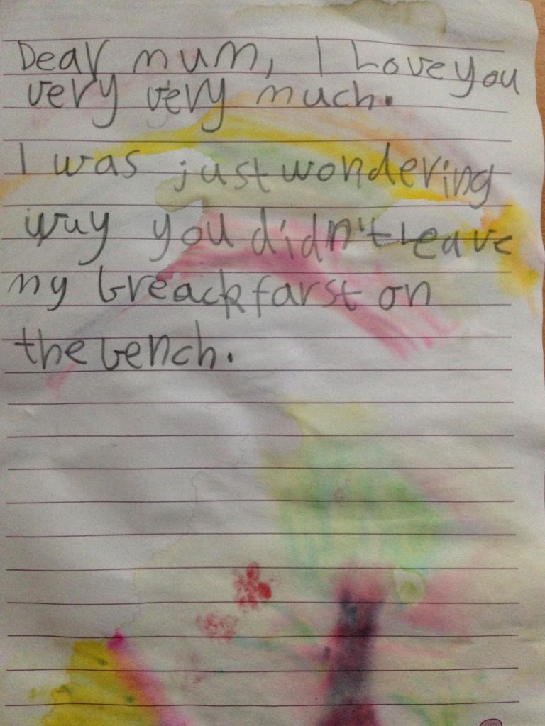 I love finding old notes and letters my kids wrote me when they were little. To be honest, I don’t recall not leaving her breakfast on the bench. I must have been distracted or she was up earlier than anticipated.